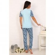Информация: Костюм женский из кулирного полотна состоит из футболки и брюк. Футболка прямая, горловина круглая, рукав короткий, втачной из отделочного полотна, низ изделия обработан на плоскошовной машине, на полочке принт. Брюки прямые, верх на поясе с резинкой, в б
